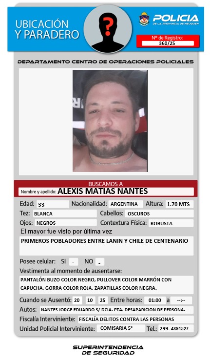 Un hombre de 34 años de edad identificado como Alexis Matías Nantes, oriundo de Neuquén, se encuentra desaparecido en Centenario desde el lunes 21 por la madrugada cuando salió del domicilio que comparte con su hermano en ela zona de Primeros Pobladores, entre Lanín y Chile del Casco Viejo.