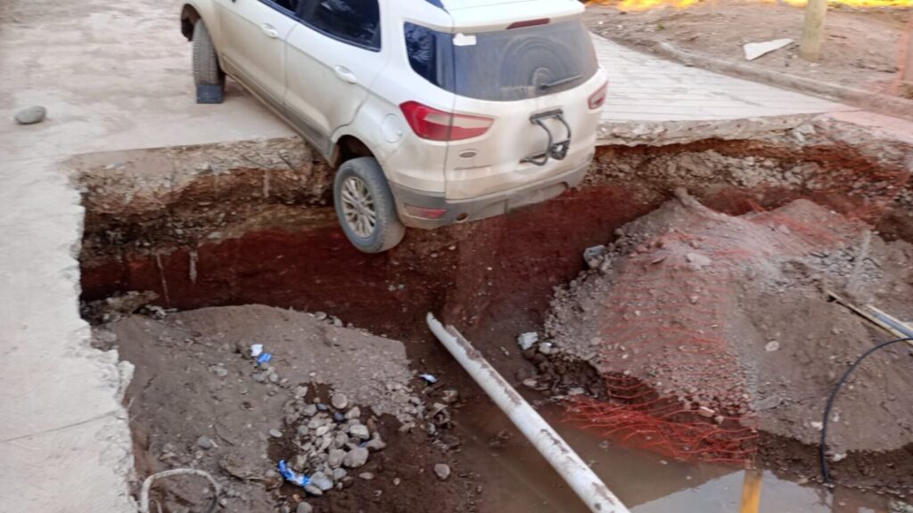 El domingo 21 cerca de las 6:30 de la mañana una camioneta Ford Ecosport conducida por una mujer de Cinco Saltos quedó con la parte trasera colgando de la obra de la calle Formosa. Al parecer quien la conducía no advirtió el corte debido a la escasa señalización y una calle lateral habilitada.