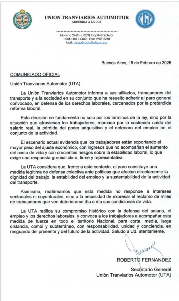 “La Unión Tranviarios Automotor informa a sus afiliados, trabajadores del transporte y a la sociedad en su conjunto que ha resuelto adherir al paro general convocado, en defensa de los derechos laborales, cercenados por la pretendida reforma laboral”, informó la UTA en un comunicado.